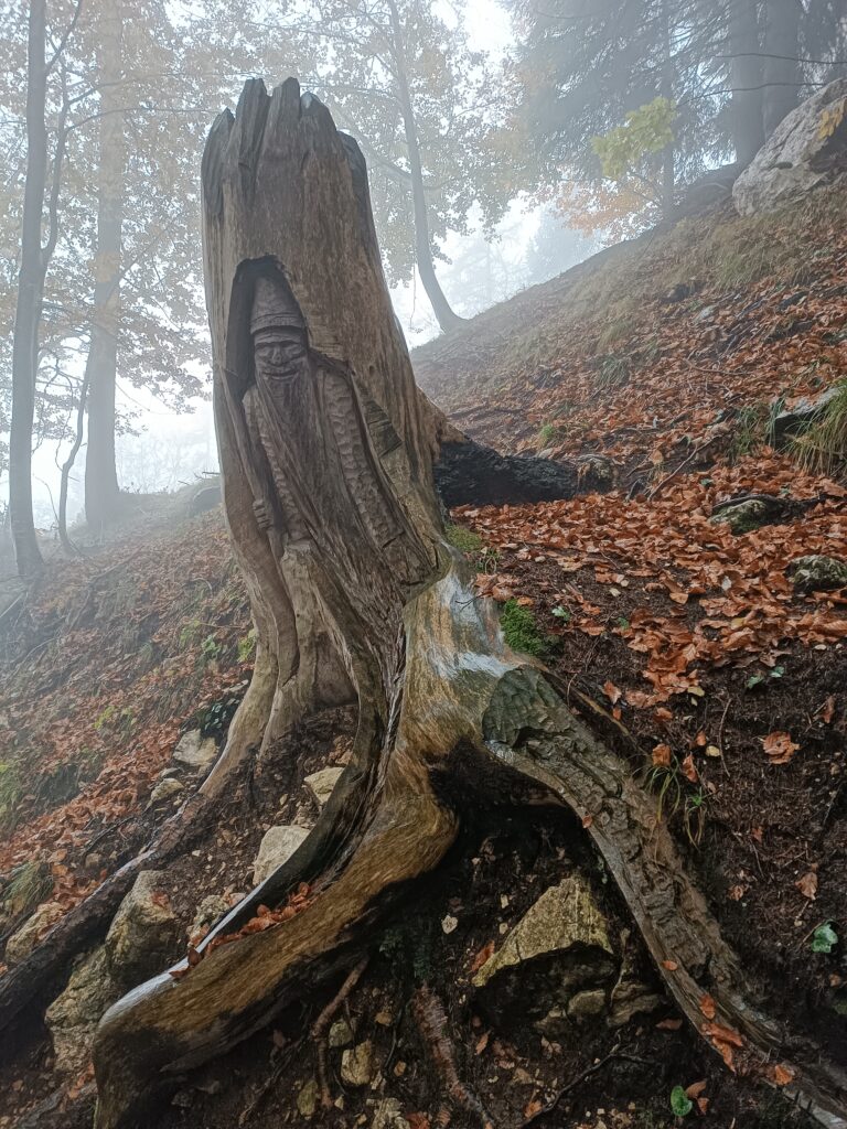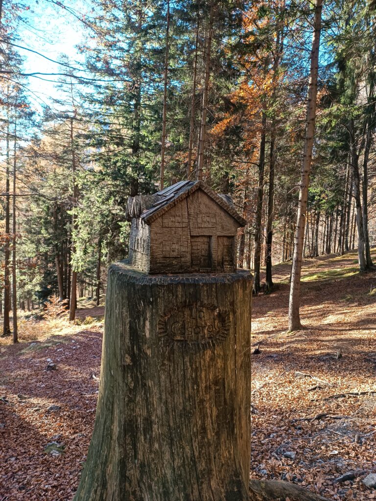 Lungo questo sentiero si possono ammirare diverse sculture a partire da una riproduzione del Rifugio e ci si può fermare a leggere la storia “el vecio Casna” e recuperare un po’ di fiato.